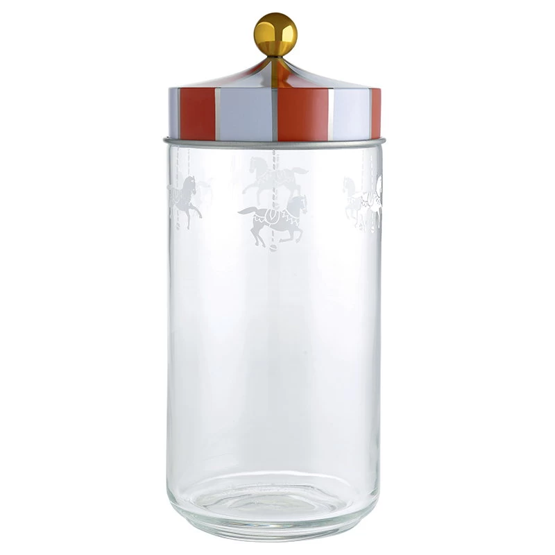 Alessi’s Circus glass jars are decorated with white carousel horses. The red and white tinplate lid features a sealing ring and a golden knob. The canisters are available in different sizes.