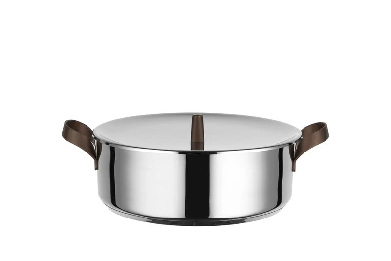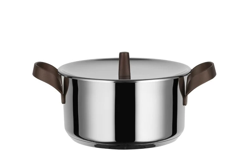 The Edo cookware set by Alessi consists of four stainless steel pots and pans with three lids, including: