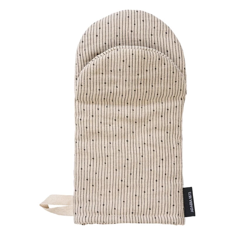 Arabia’s Mainio Sarastus oven mitten gives kitchens and cooking activities a touch of timeless Finnish design with a contemporary spirit. Symbolizing the power of light, the Sarastus (”dawn”) pattern was inspired by Raija Uosikkinen’s Ivalo decoration from 1965, with its rhythmic lines arranging into a new, fresh shape for the Mainio Sarastus collection. The padded oven mitten is made of 100% linen.