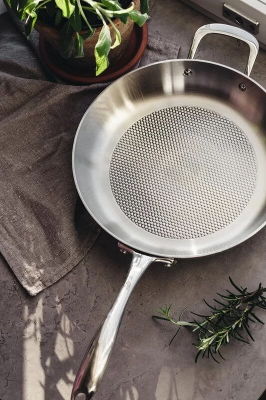 Heirol’s Allsafe frying pan is a very durable uncoated steel frying pan for frying and stewing. The five-layer structure of the pan ensures even and efficient heat distribution throughout the pan – the pan heats up quickly and energy-efficiently. The ergonomically shaped handle facilitates easy handling of the steel pan.