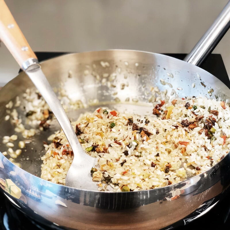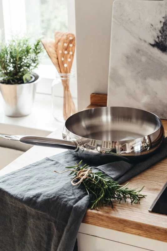 The Belly steel frying pan is suitable for all types of cookers. When frying in a steel pan, it is recommended to use plenty of frying oil, and the pan is, therefore, best suited for cooking steaks, vegetables or chicken. If desired, you can also season the pan before use and as needed. Thanks to the round edges, the Belly pan is also ideal for cooking risottos, for example, and it is also oven-resistant – remember, however, that the steel handle heats up easily.