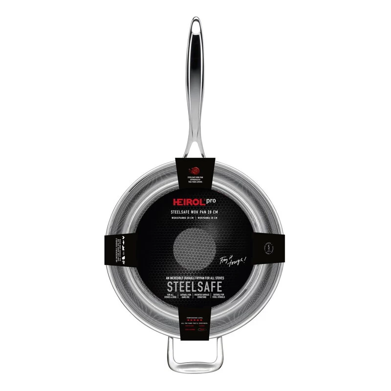 Heirol’s Steelsafe wok pan combines the excellent frying properties of a steel pan with the ease of use of a coated pan. The steel frying pan withstands even severe heat and is equipped with a heat-storing aluminium core, which allows the heat to be distributed evenly and efficiently.