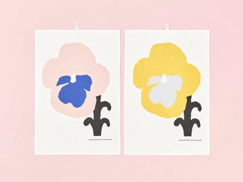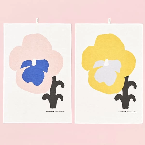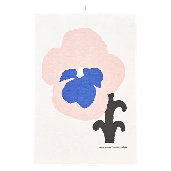 The Orvokki tea towel from Kauniste features a detail from Hannele ĂijĂ€lĂ€âs delightful floral pattern that depicts large violets in blue and pink. The towel is made from a mix of linen and cotton, and it has a convenient loop for hanging.