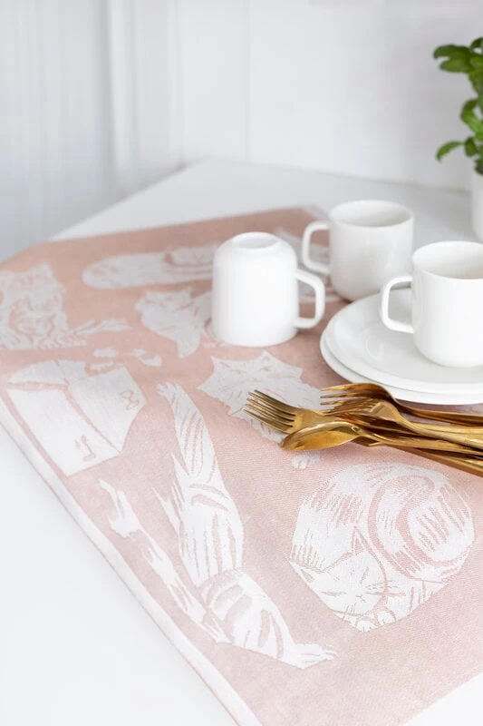 The Kissanpäivät hand towel by Lapuan Kankurit features charming and beautiful cats which are created by illustrator Matti Pikkujämsä. Made from a linen-cotton blend, the shades of the towel are delightfully cosy. The cute cat pattern is mirrored on the other in opposite colours. The materials for the Kissanpäivät towel are from Europe, mainly from Finland. The hand towel is sewn in a sewing factory in Lithuania or in Finland at the own weaving mill of Lapuan Kankurit.