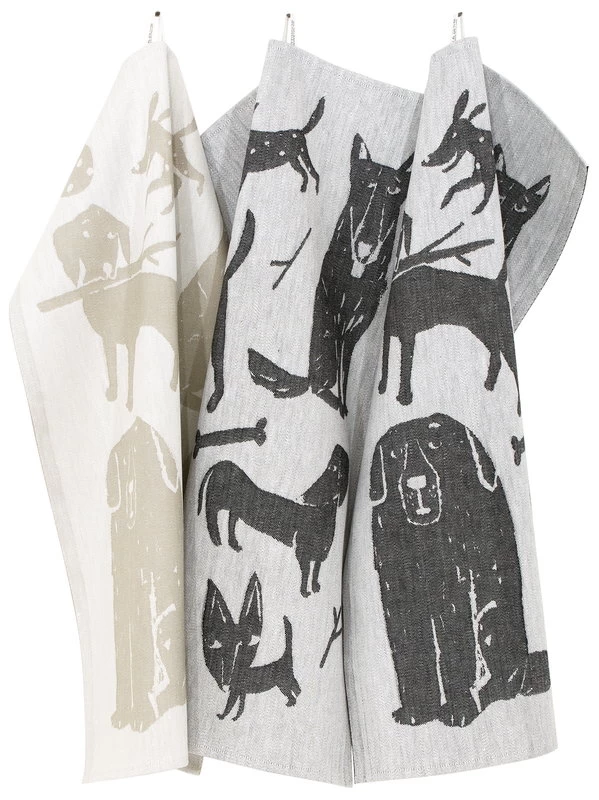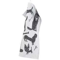 The Koirapuisto tea towel by Lapuan Kankurit is adorned with a joyful pack of dogs drawn by Finnish illustrator Matti Pikkujämsä. Koirapuisto is Finnish for ”dog park”. The black-and-white colour palette gives the towel a graphic appearance, and the pattern repeats on the other side with opposite colours. The tea towel is made of a high-quality blend of linen and cotton, and it has been woven in Finland at the own weaving mill of Lapuan Kankurit.