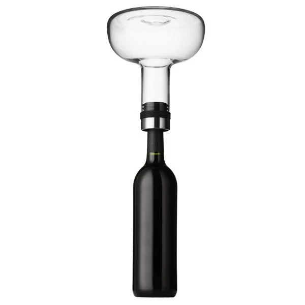 The beautiful decanter, originally invented by wine expert Peter Ørsig, is also easy to use: place the bottle on the table and attach the carafe to the bottleneck. Then, carefully turn the bottle over and allow the wine to flow into the carafe. The wine breather spreads the wine so that it splashes through the neck of the carafe and flows down its sides, providing the maximum possible surface area. The wine can be served in the refined carafe, but if you prefer to have the original bottle on the table, just turn the carafe over again and the wine flows back into the bottle.